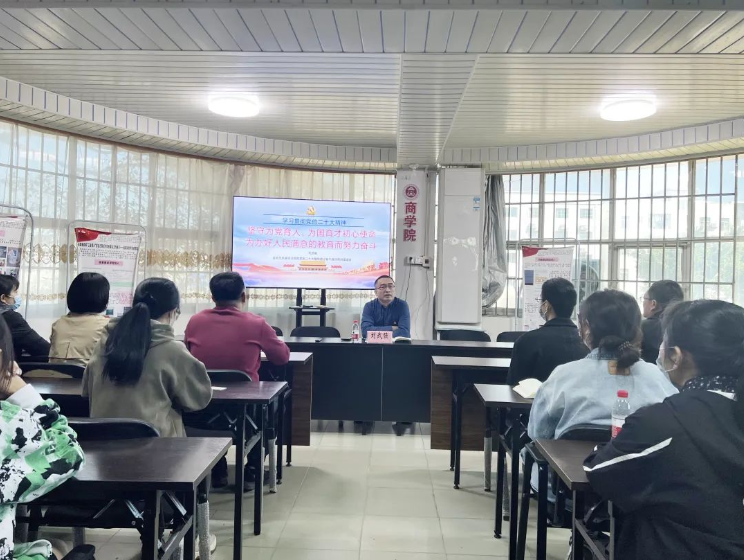 12月16日,省教育系统学习贯彻党的二十大精神理论骨干教师宣讲团成员、商学院院长刘武强教授为商学院教师宣讲党的二十大精神。
