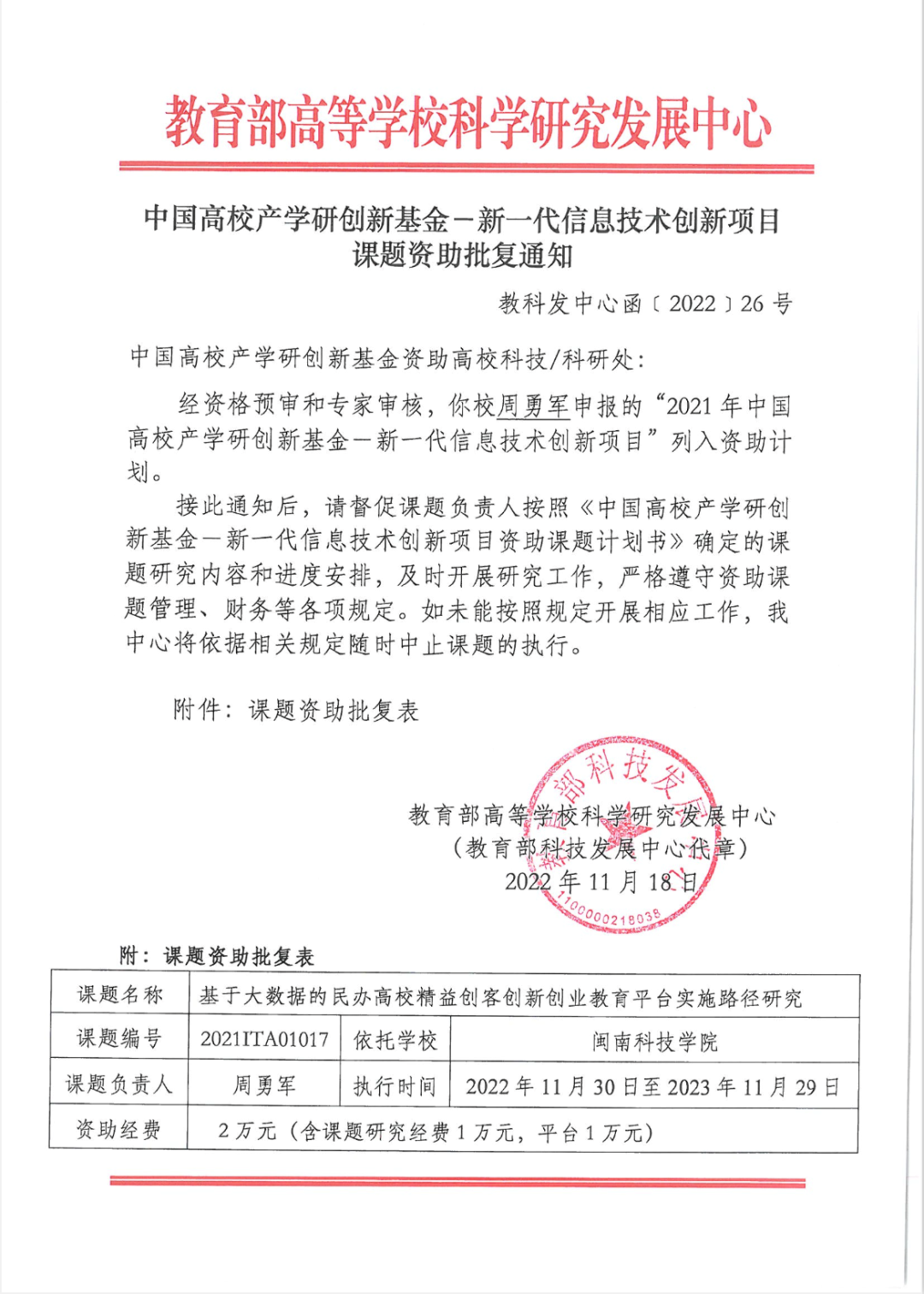 近日,我校周勇军副研究员申报的《基于大数据的民办高校精益创客创新创业教育平台实施路径研究》获得“中国高校产学研创新基金”立项。
