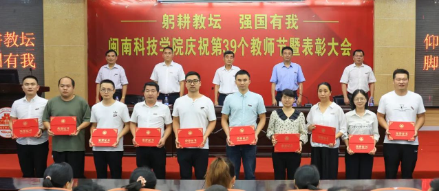 9月13日下午,我校隆重召开庆祝第39个教师节暨表彰大会。校领导游小波、李旭、周勇军、林树生、邱永渠出席表彰大会。校长游小波代表学校党政致辞。常务副校长周勇军、副校长邱永渠宣读表彰名单。表彰大会由校党委书记李旭主持。