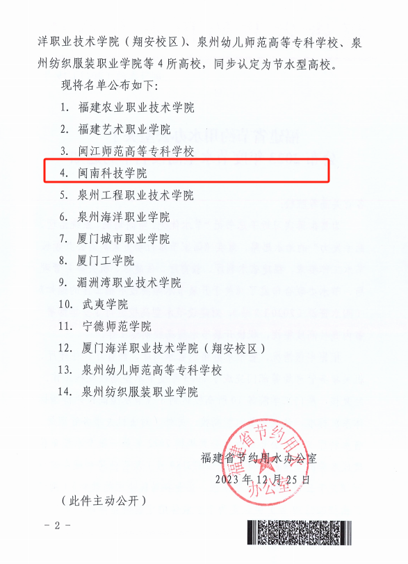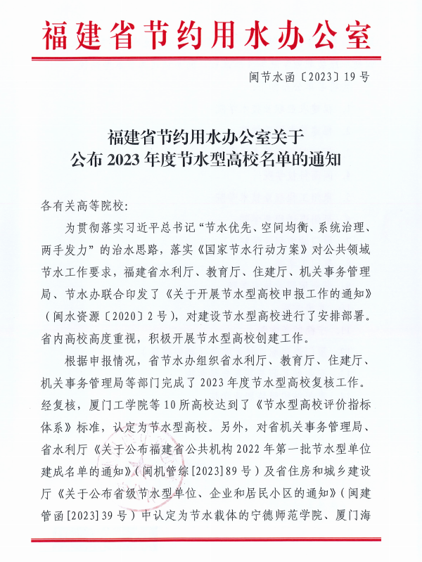近日,福建省节约用水办公室组织省水利厅、教育厅、住建厅、机关事务管理局等部门完成2023年度节水型高校复核工作。我校获评“福建省2023年度节水型高校”荣誉称号。