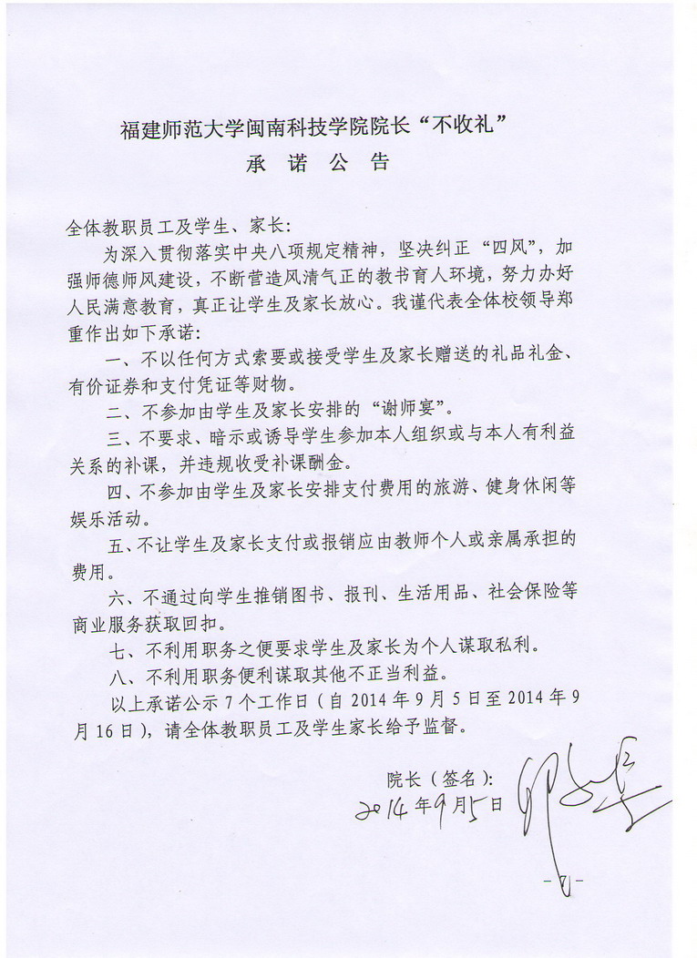 福建师范大学雷速网页版院长“不收礼”承诺公告